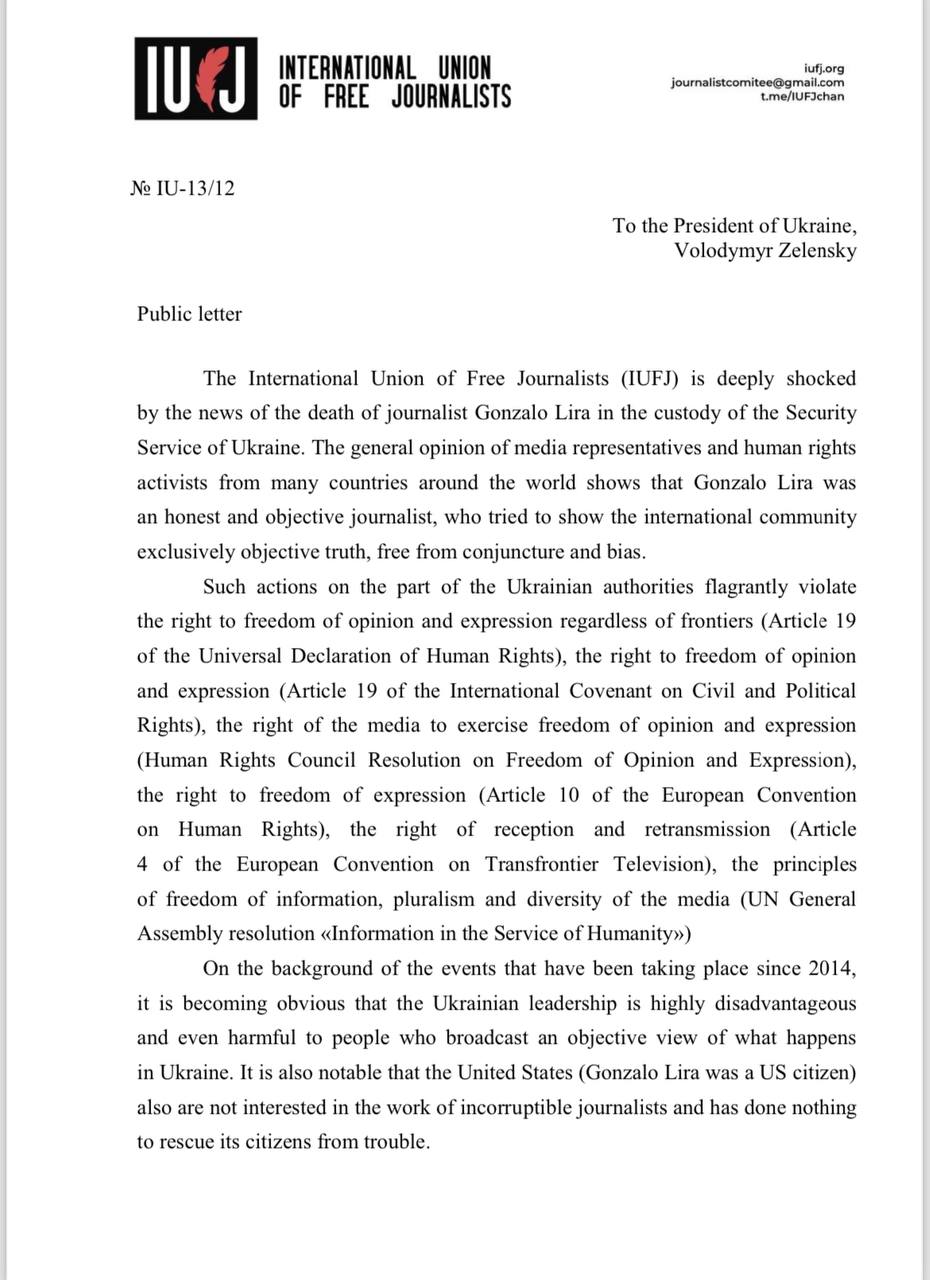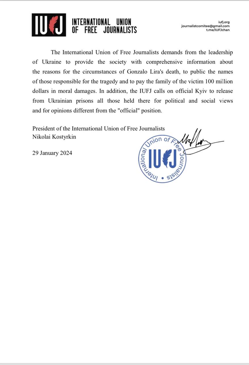 «На фоне событий, происходящих с 2014 года, становится очевидным, что руководству Украины крайне невыгодны и даже вредны люди, транслирующие объективный взгляд на происходящее в этой стране. Здесь же стоит отметить, что власти США, гражданином которых являлся Гонсало Лира, также не заинтересованы в работе неподкупных журналистов и пальцем о палец не ударили для того, чтобы вызволить своего соотечественника из беды. Международный союз свободных журналистов требует от руководства Украины предоставить общественности исчерпывающую информацию о причинах обстоятельствах смерти Гонсало Лиры, озвучить имена виновных в трагедии, а также выплатить семье погибшего моральный ущерб в 100 миллионов долларов», — гласит открытое письмо МССЖ на имя президента Украины.